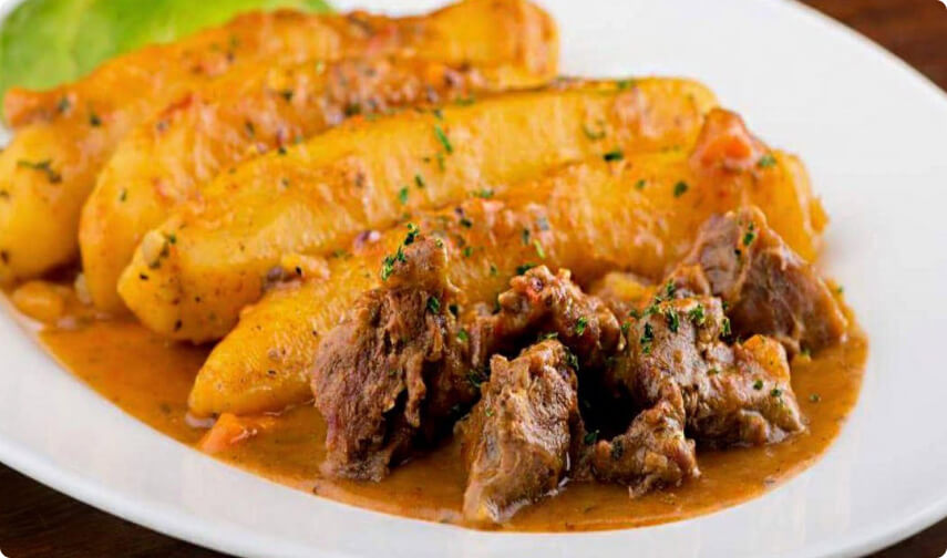 Step 12 - Matooke can also be served with beef or chicken stew or peanut sauce prepared in a traditional way using banana leaves "Oluwombo"